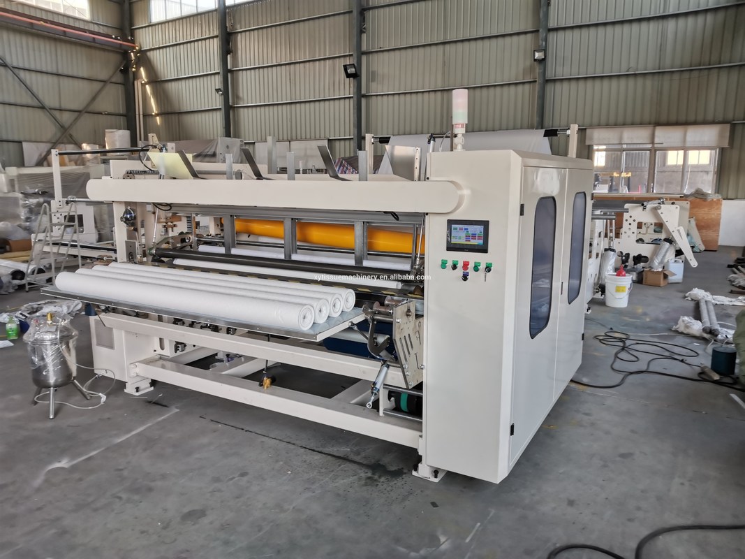 A máquina tem a unidade de alimentação do núcleo, pode fazer ambos com e sem o núcleo. Matéria prima do rolo enorme após a gravação completa ou a gravação da borda, então a perfuração, corte do fim e para pulverizar a colagem da cauda para transformar-se um log. Então pode funcionamento com a máquina de corte e a máquina de embalagem transformar-se os produto acabados. A máquina é controlada por PLC, pessoa opera-o através do tela táctil, o processo inteiro é automática, fácil de operar, abaixa o custo do homem. E nossa máquina pode especial-feito de acordo com clientes exigências.